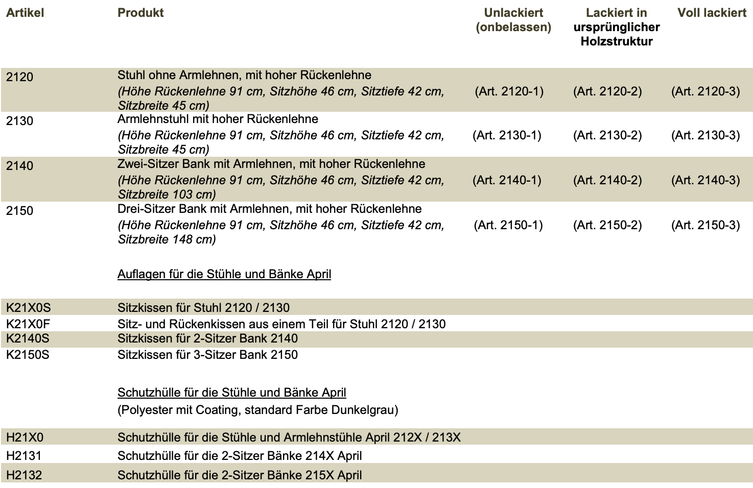Eine Reihe von Gartenmöbeln in einem eleganten Stil. Zeitloses Design mit engeren Linien, haltbaren Materialien und einer soliden Konstruktion machen diese Serie von Gartenmöbeln zu einem schönen und guten Produkt für den Außenbereich. Die Sitze und Bänke sind klappbar. Der Rahmen ist aus massivem Stahl gefertigt, rostfrei verzinkt und farbig lackiert. Die Standardfarbe für den Rahmen ist schwarz-grün. Die April-Serie zeichnet sich durch gerade Armlehnen (Sessel) und breite (4 cm) Sitz- und Rückenleisten aus. Die Hartholzlatten können unlackiert (unbehandelt) oder lackiert bleiben. Die Lackierung kann so erfolgen, dass die Maserung des Hartholzes sichtbar bleibt oder vollständig lackiert wird, wobei die Maserung des Hartholzes im Sitz- / Rückenbereich nicht mehr sichtbar ist. Die Standardfarbe ist auch Schwarzgrün für die Hartholzlatten. Wir lackieren jedoch in jeder gewünschten RAL-Farbe. Wird nur der Stahlrahmen in einer anderen als der Standardfarbe lackiert, wird ein Zuschlag von 5% erhoben. Wenn sowohl der Stahlrahmen als auch die Hartholzlatten in einer anderen Farbe lackiert sind, wird ein Zuschlag von 10% erhoben. Diese Stühle und Bänke lassen sich gut mit verschiedenen Tischen kombinieren, sowohl mit einer Platte aus unbehandeltem Hartholz als auch mit einer Platte aus Naturstein, einer lackierten Stahlplatte oder einer Platte aus Glas.
