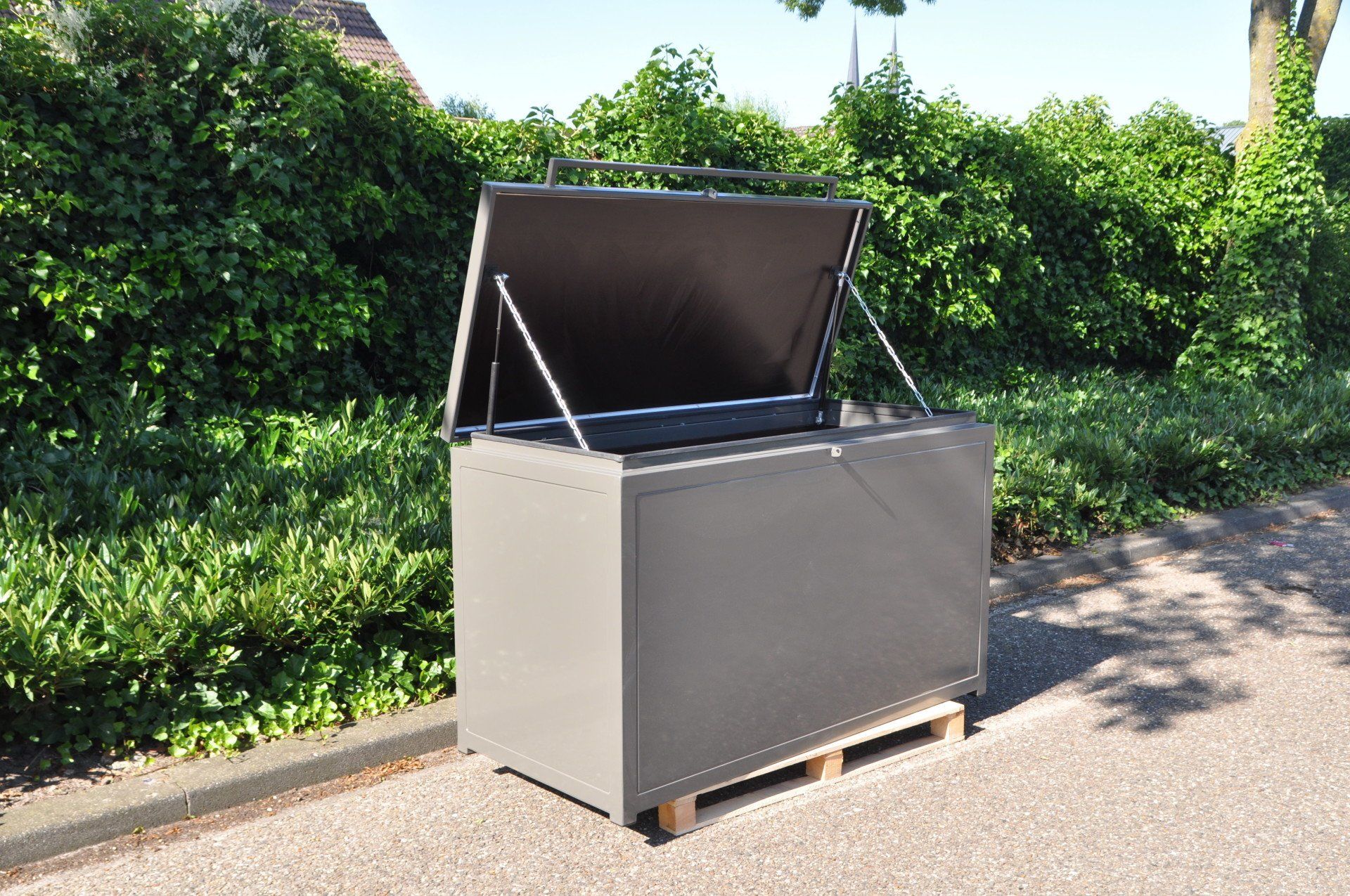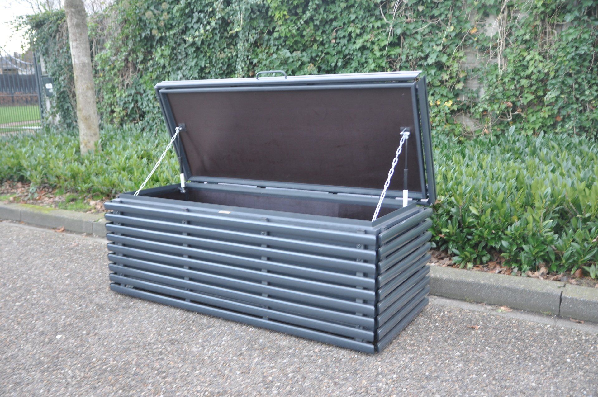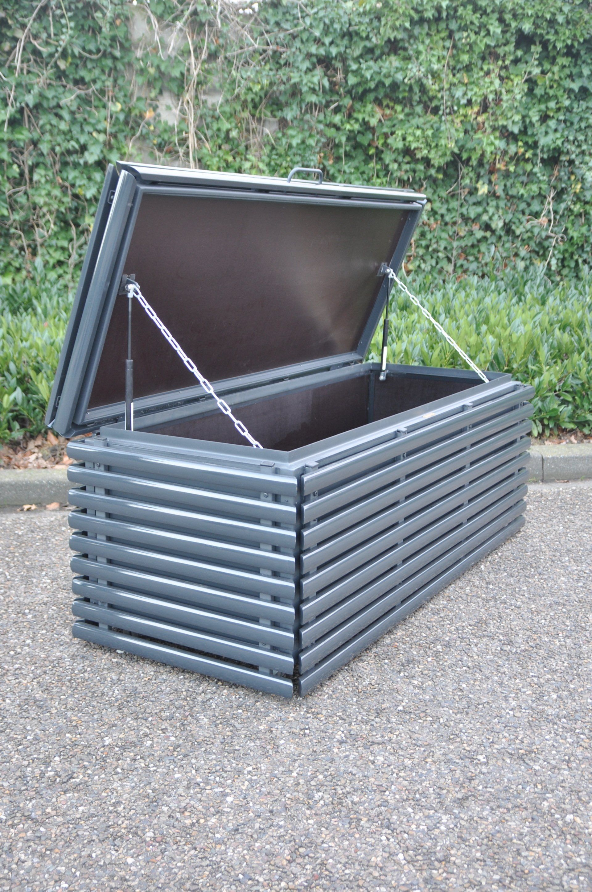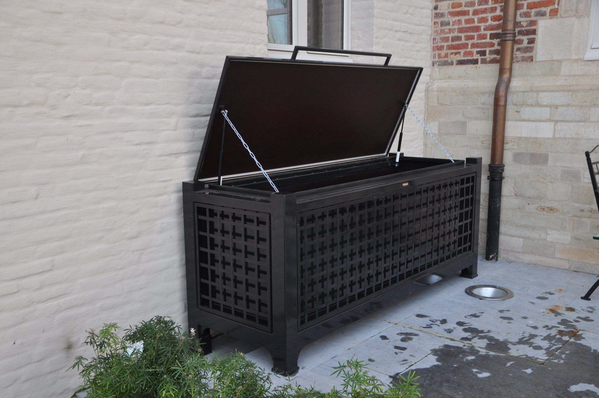 Cushion box / storage box made of steel. On the outside in the side panels there will be a wickerwork grid made of stainless steel. Very solid construction and finished in detail. The entire box is completely coated in any desired RAL color.
