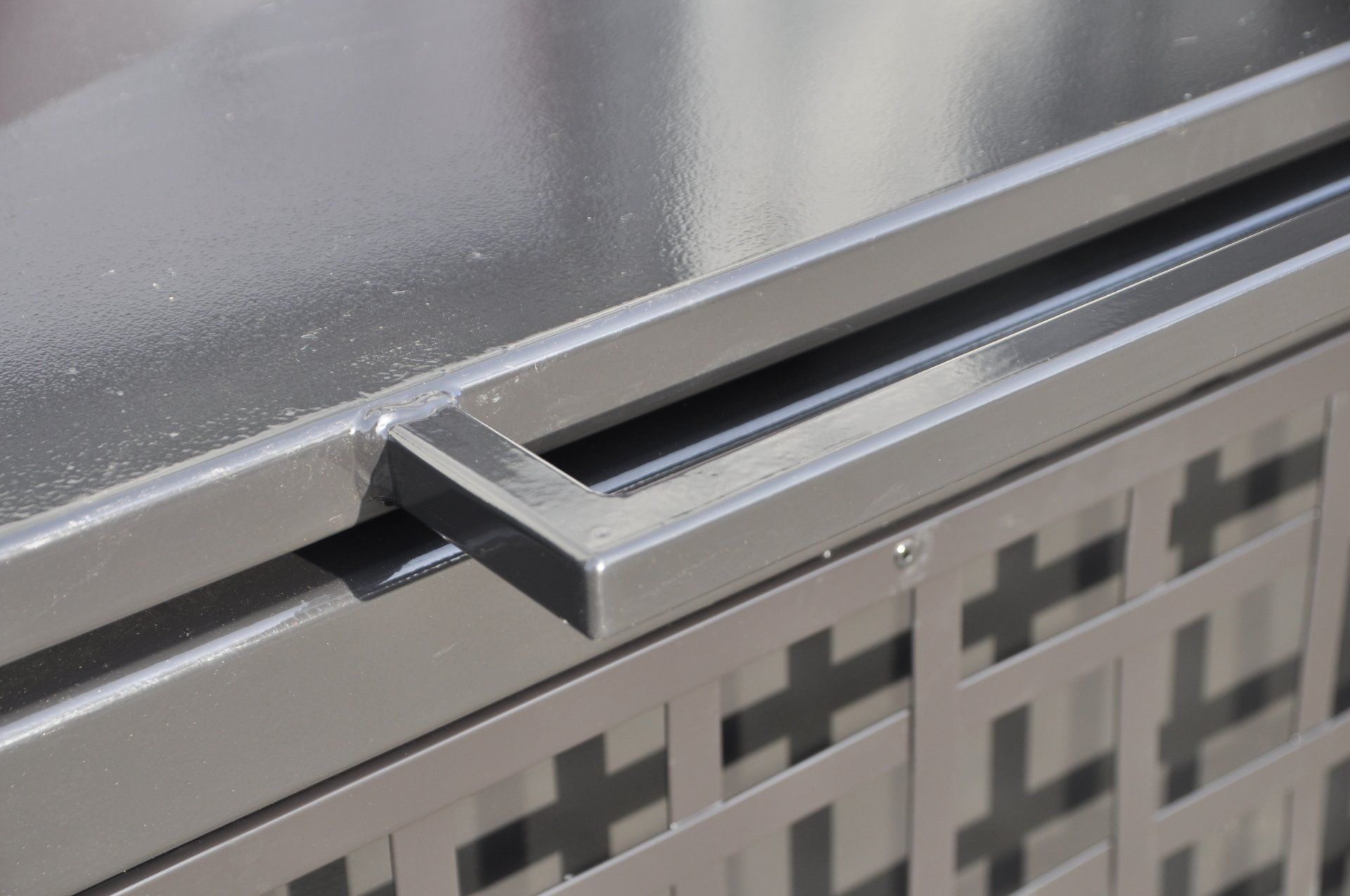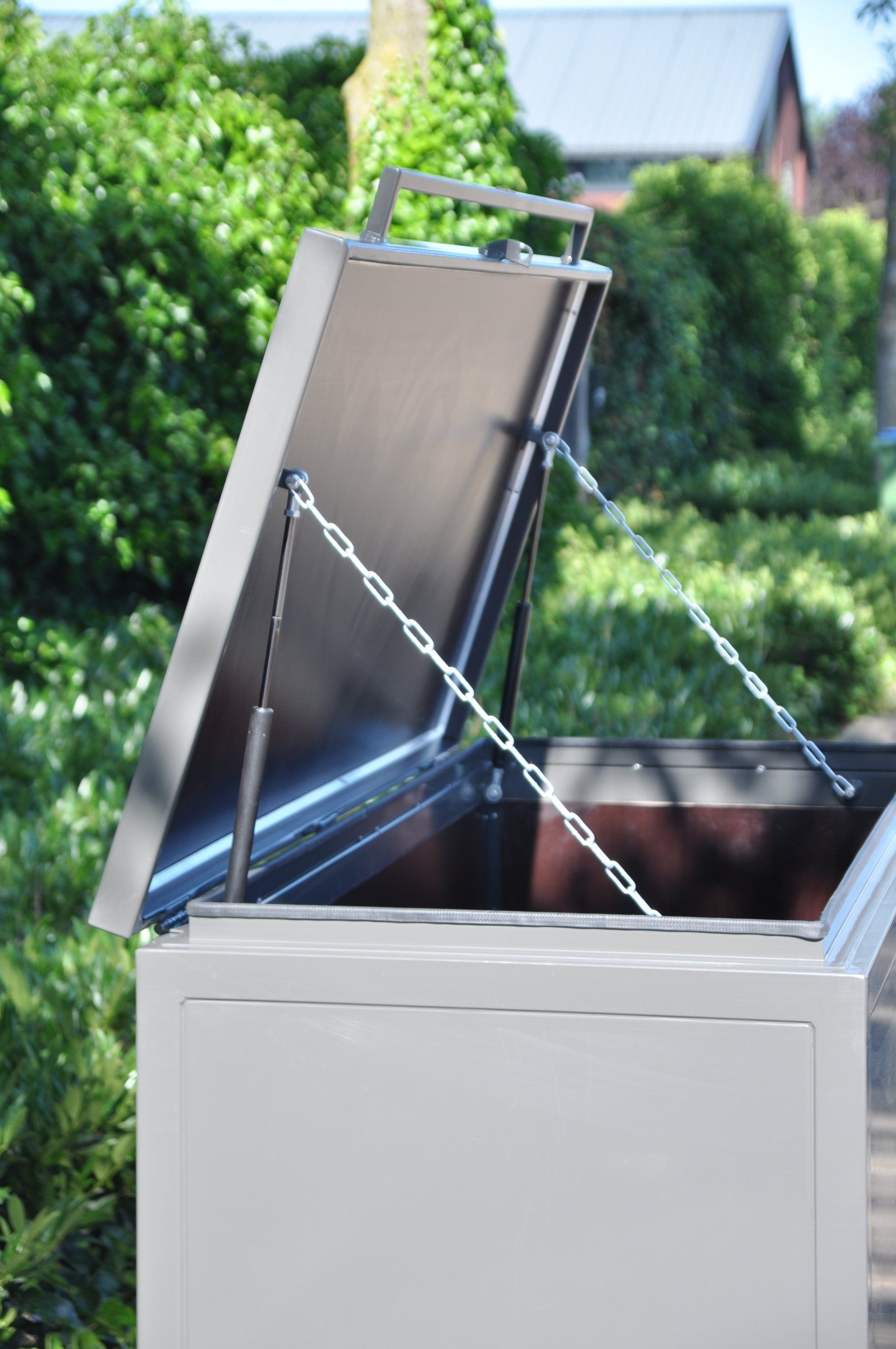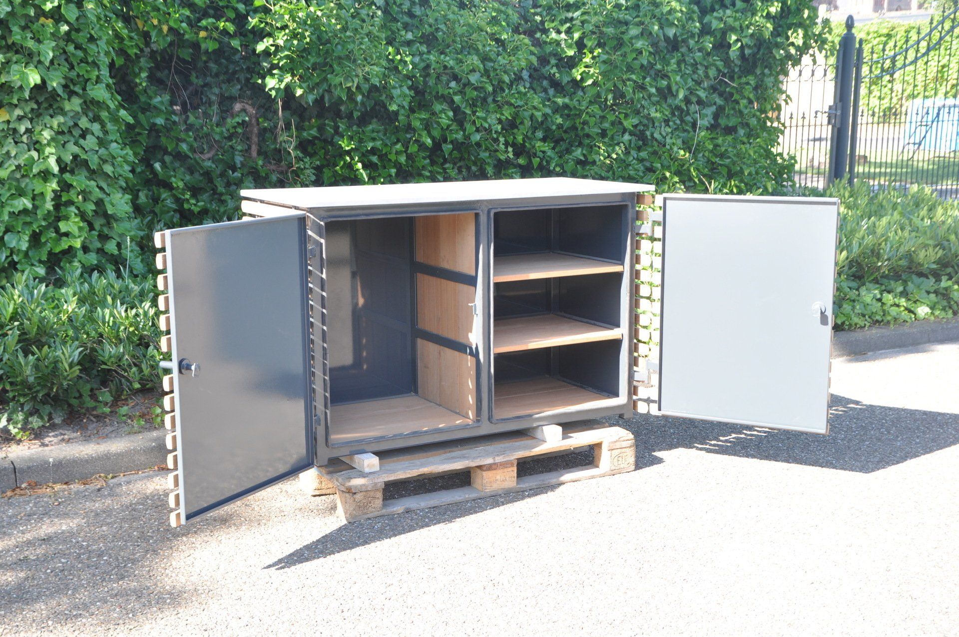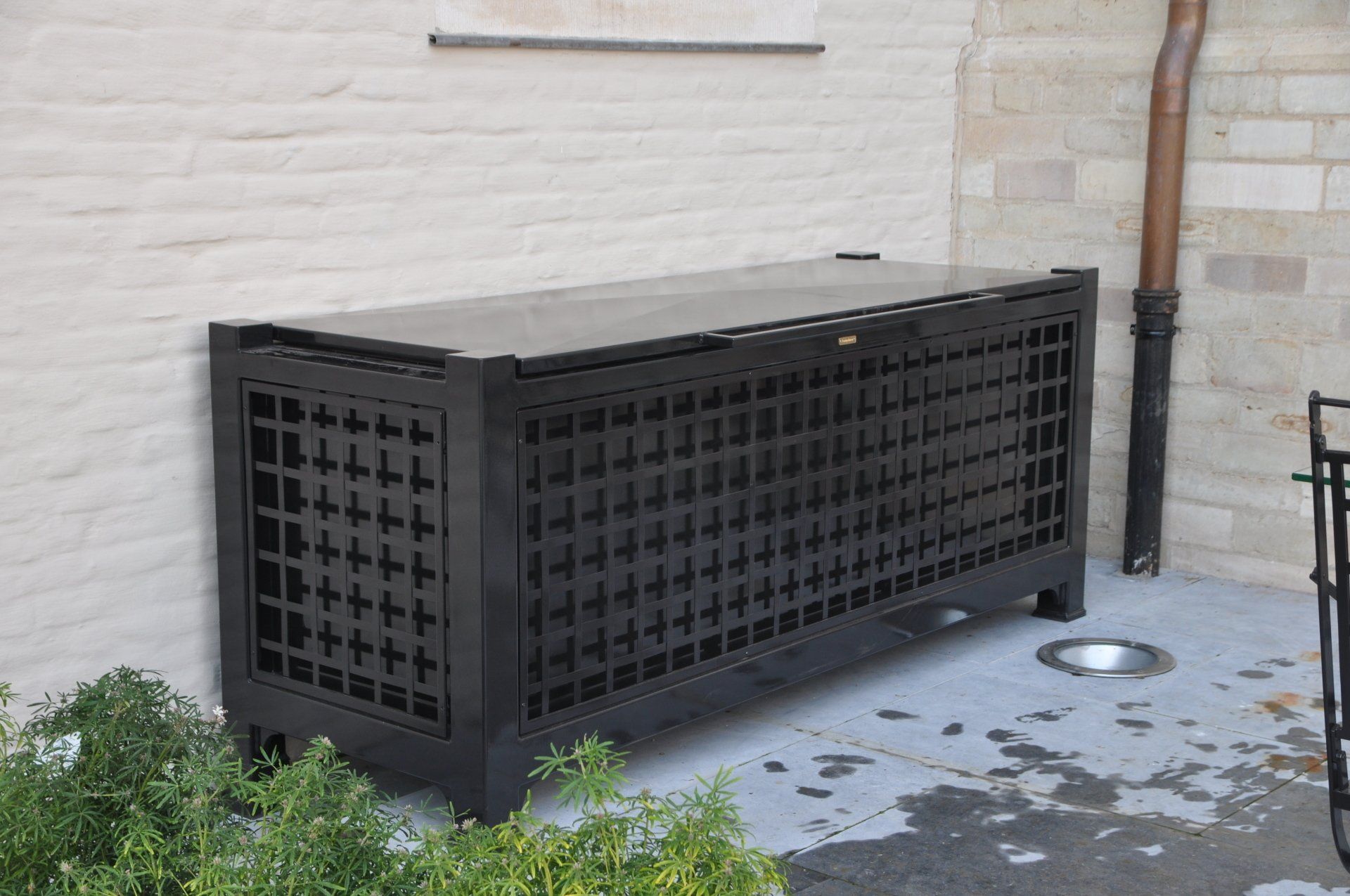 Cushion box / storage box made of steel. On the outside in the side panels there will be a wickerwork grid made of stainless steel. Very solid construction and finished in detail. The entire box is completely coated in any desired RAL color.