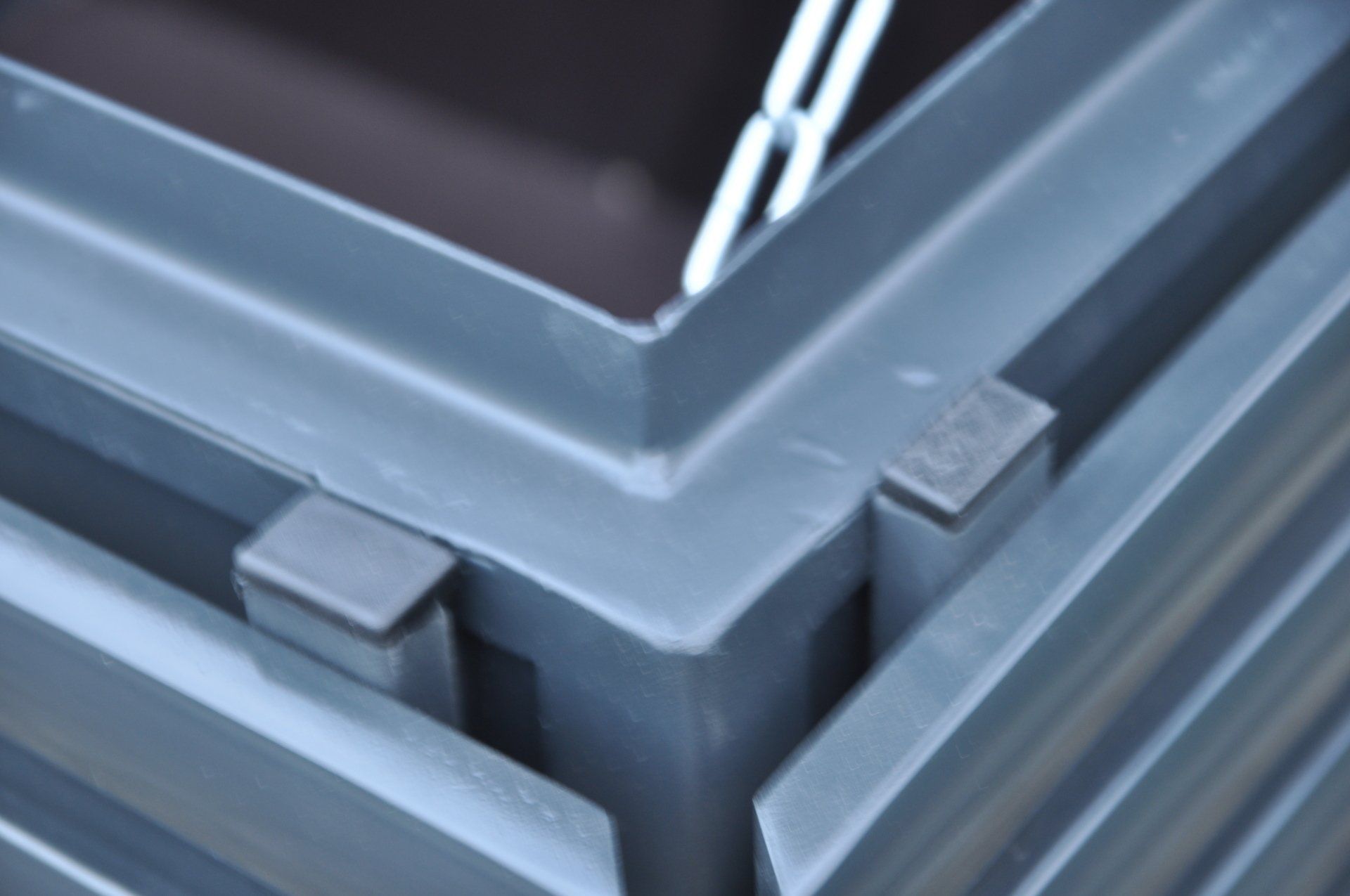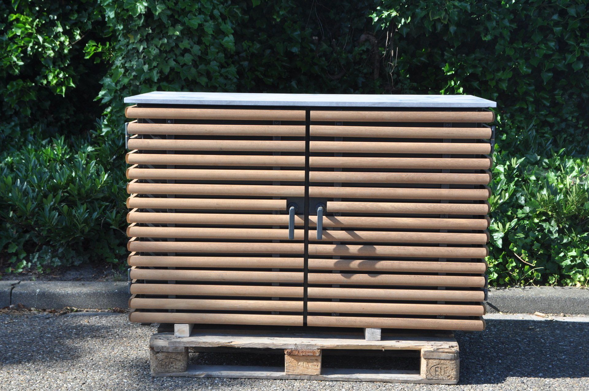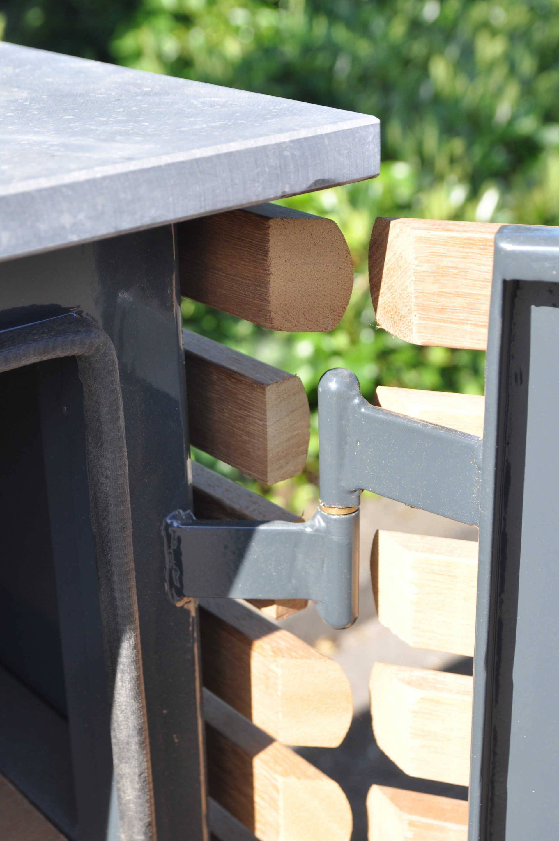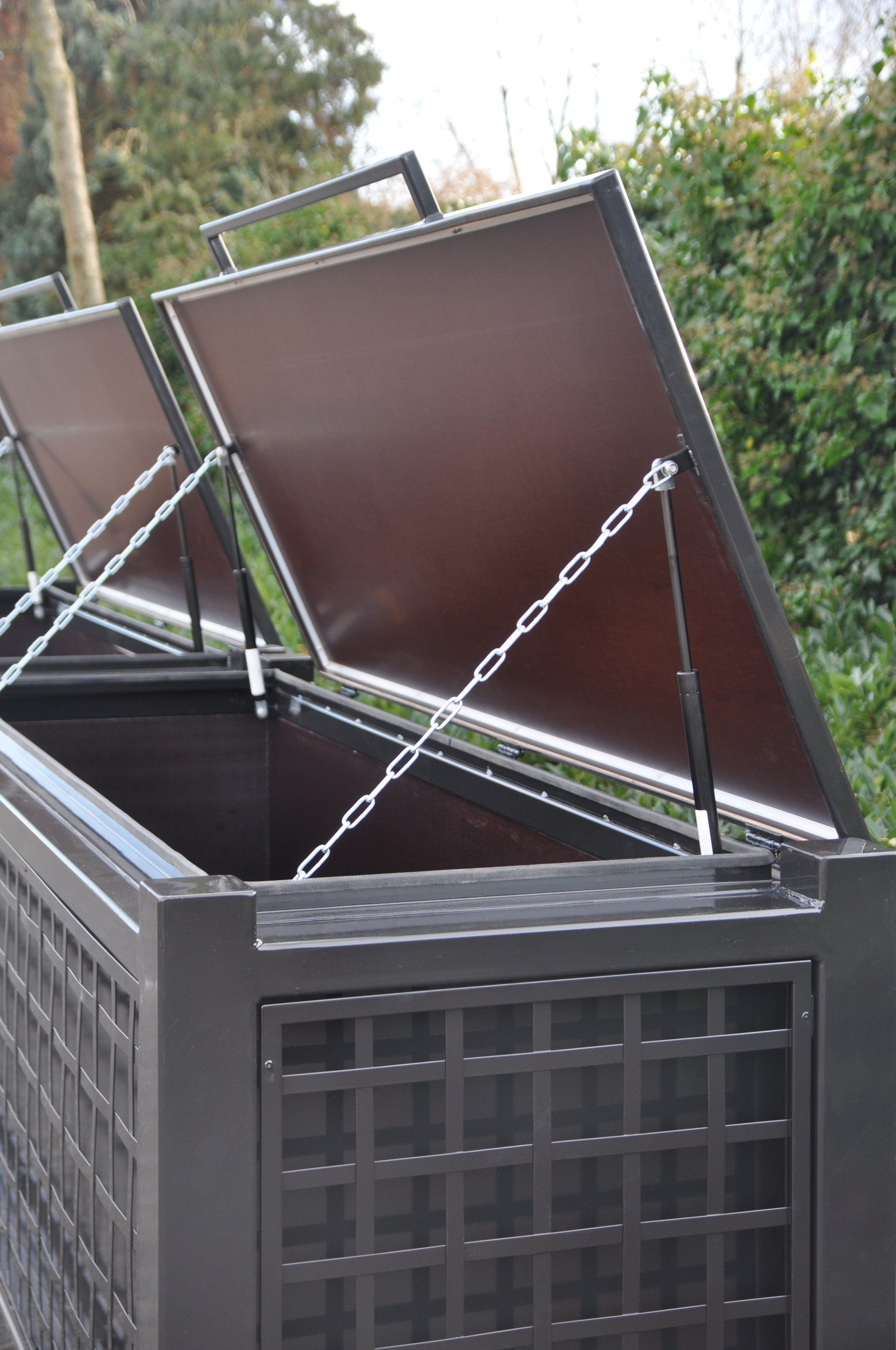 Cushion box / storage box made of steel. On the outside in the side panels there will be a wickerwork grid made of stainless steel. Very solid construction and finished in detail. The entire box is completely coated in any desired RAL color.