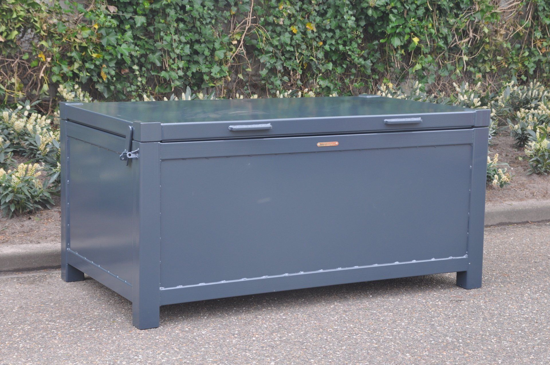 Cushion box / storage box itself made of steel. On the outside smoothly finished with sheet material of lacquered steel. Solid construction and quality finish.