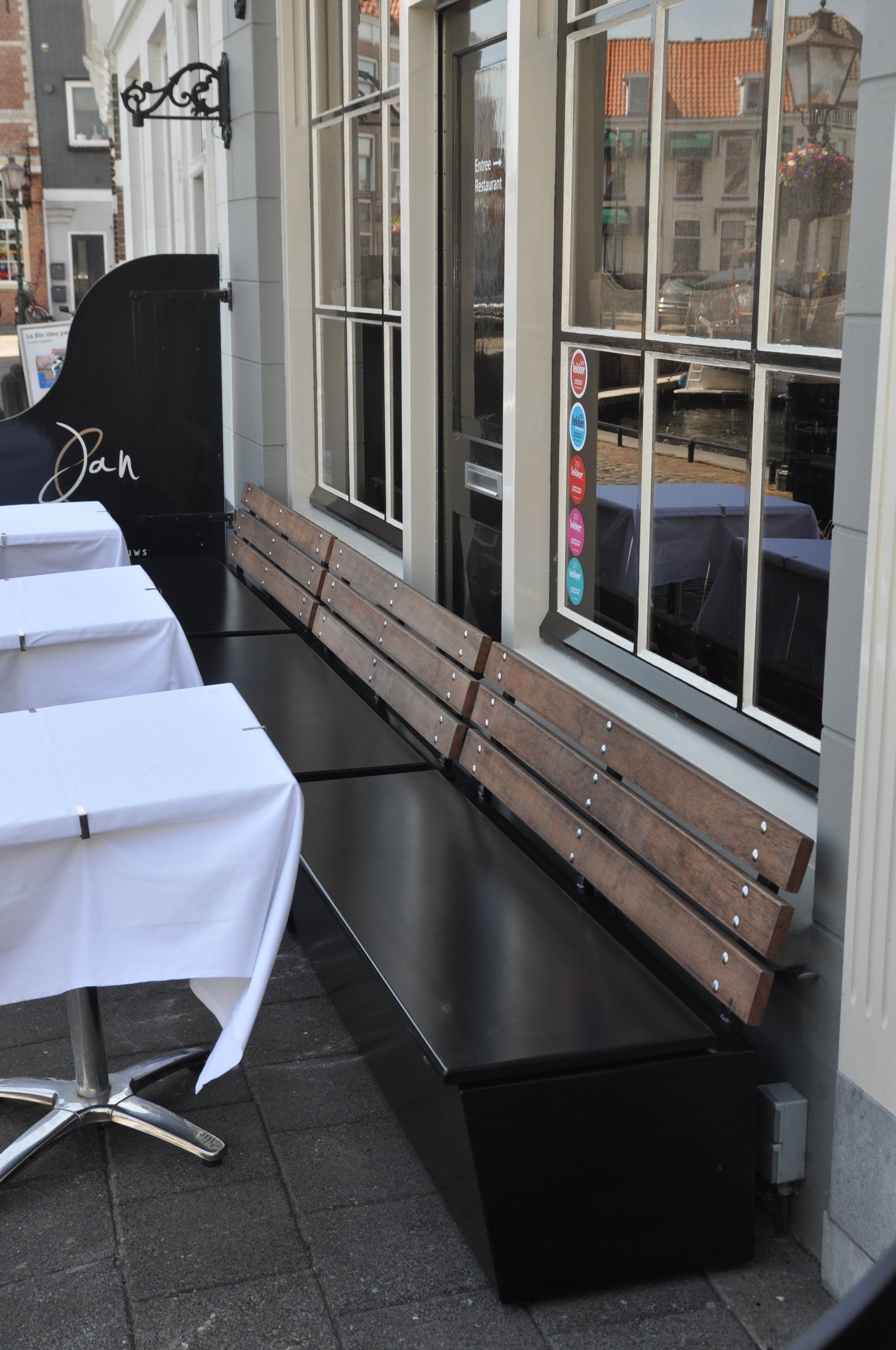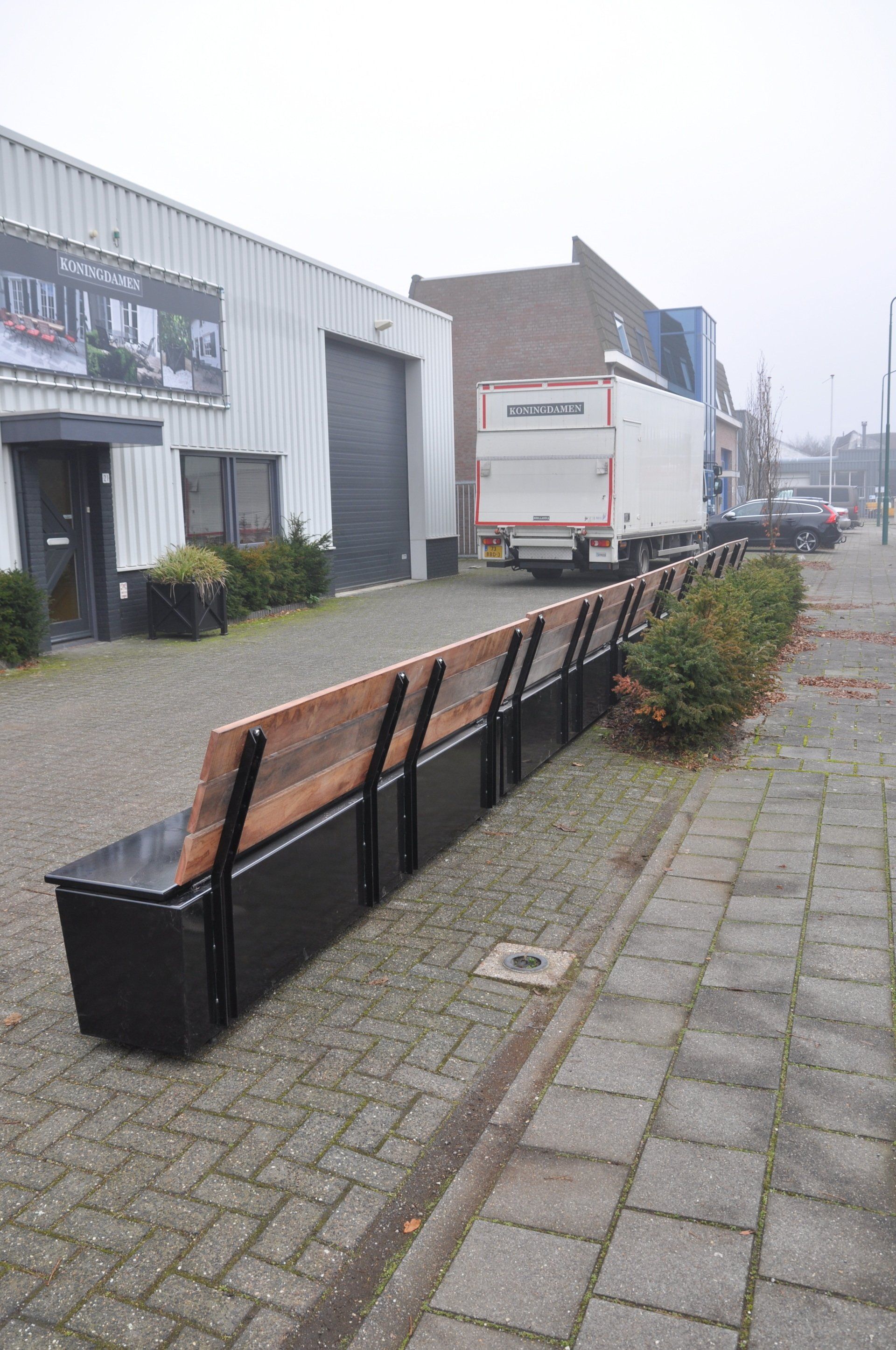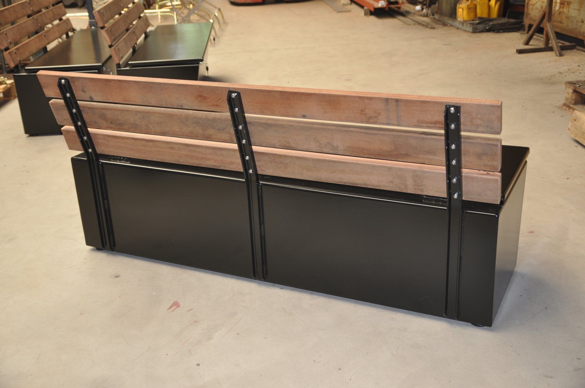 Combination of a long sofa / bench with a cushion box. Fully customized. Construction made of steel, well galvanized against rust and then coated in any desired