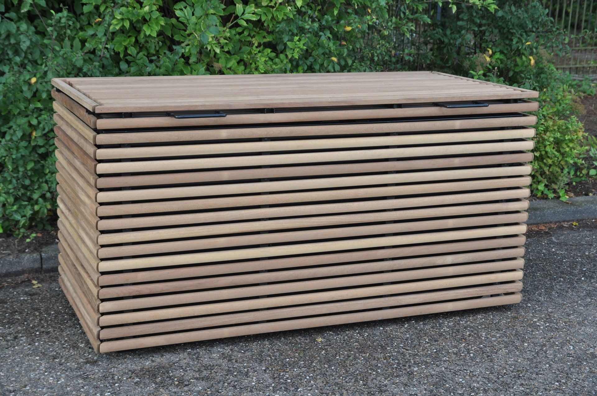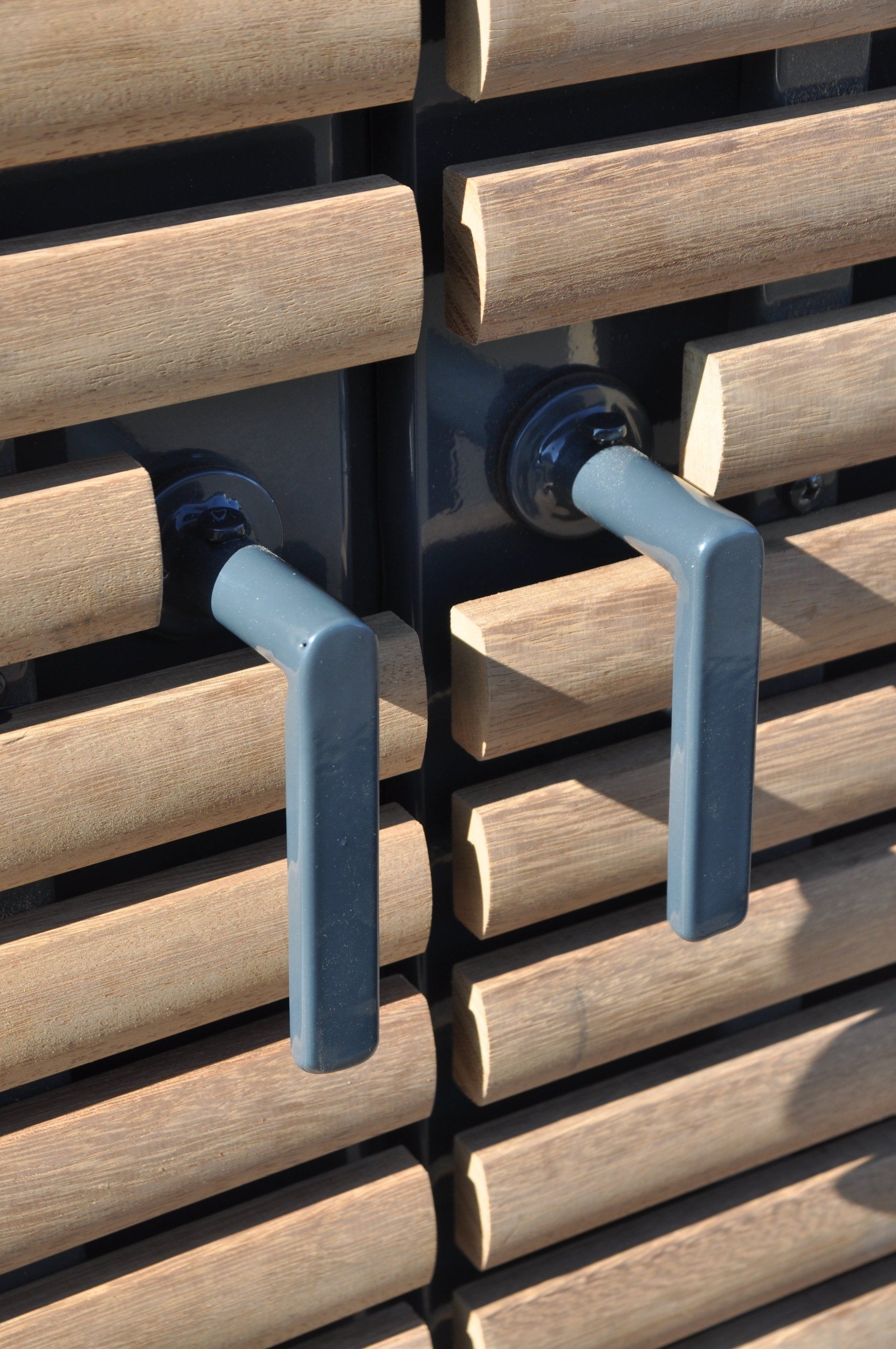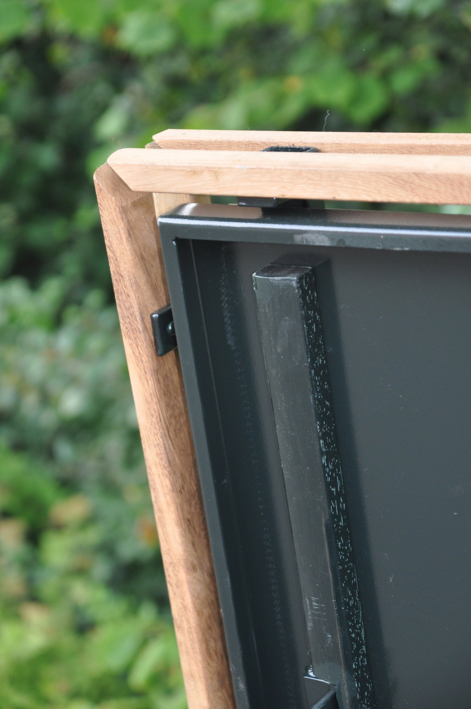 The hardwood slats come 'a bit' apart from the box itself, with a small space in between, giving you a beautiful depth effect with beautiful light. The cushion box is beautifully finished. The cushion box itself is coated in color, which is possible in any desired RAL color, no additional costs. Then the hardwood slats come, which remain unvarnished (untreated), the hardwood will then turn grey over time.