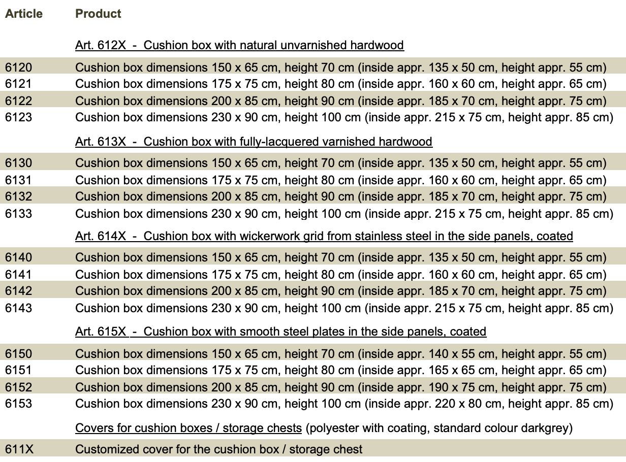 Program of cushion boxes and storage boxes, in various designs and sizes. All cushion boxes and storage boxes are made to measure. Also fully customized.
