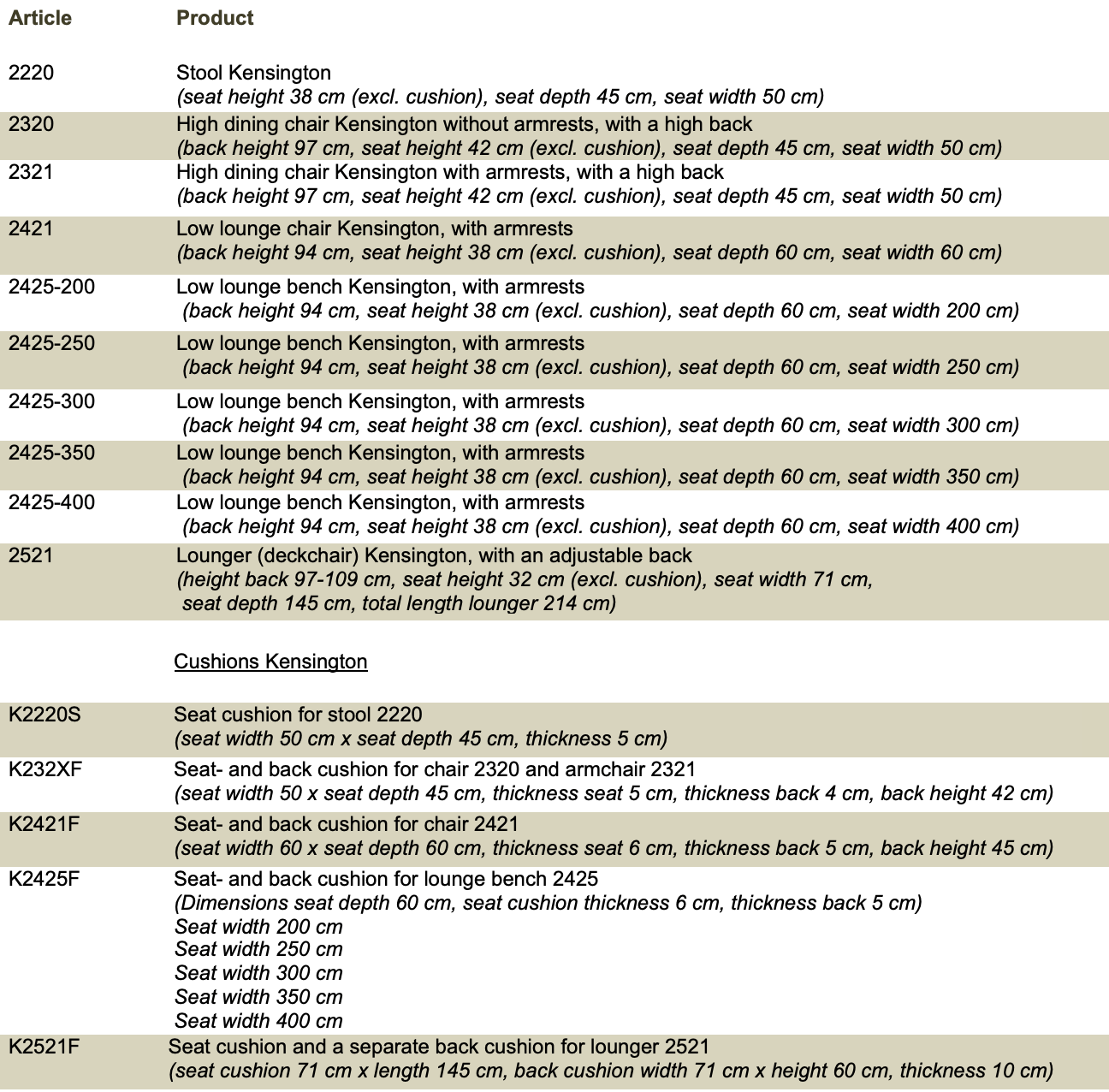 KENSINGTON SERIES - CHAIRS, LOUNGECHAIRS, BENCHES, LOUNGERS