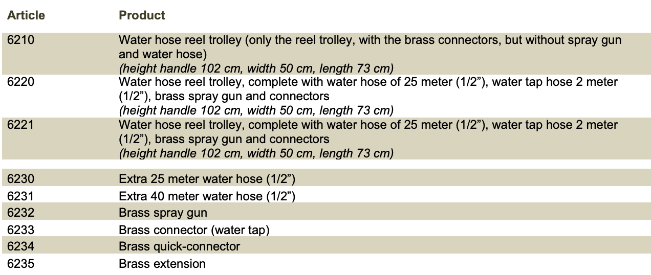 The entire frame is painted as standard in matte black with a fine structure. Available on request in any desired RAL color. With a water hose made of high quality EPDM rubber (thickness ½ inch), options in length of 25 meters or 40 meters. Optional with extra water hose(s). In addition, a solid brass, adjustable spray gun and solid brass couplings for connecting the water hoses. For connection to a water point a loose tap hose, standard length 2 meter. The water hoses are standard in matte black.