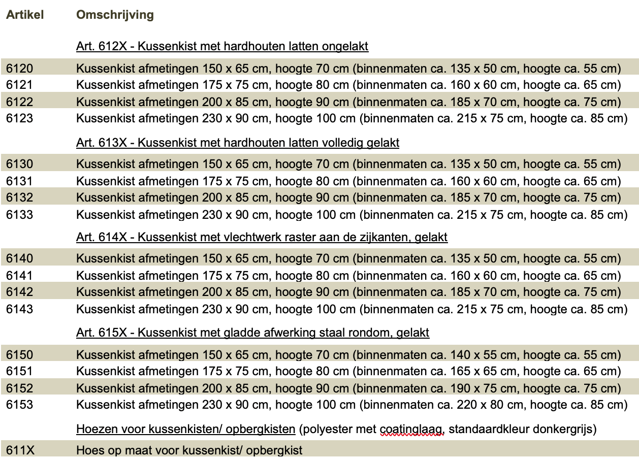 Programma van kussenkisten en opbergkisten, in diverse uitvoeringen en maten. Alle kussenkisten en opbergkisten worden op maat gemaakt. Ook volledig maatwerk. In het productoverzicht enkele voorbeelden van afmetingen. Een degelijk en prachtig product dat probleemloos buiten kan blijven staan, zomer en winter. De kussens liggen netjes droog opgeborgen.