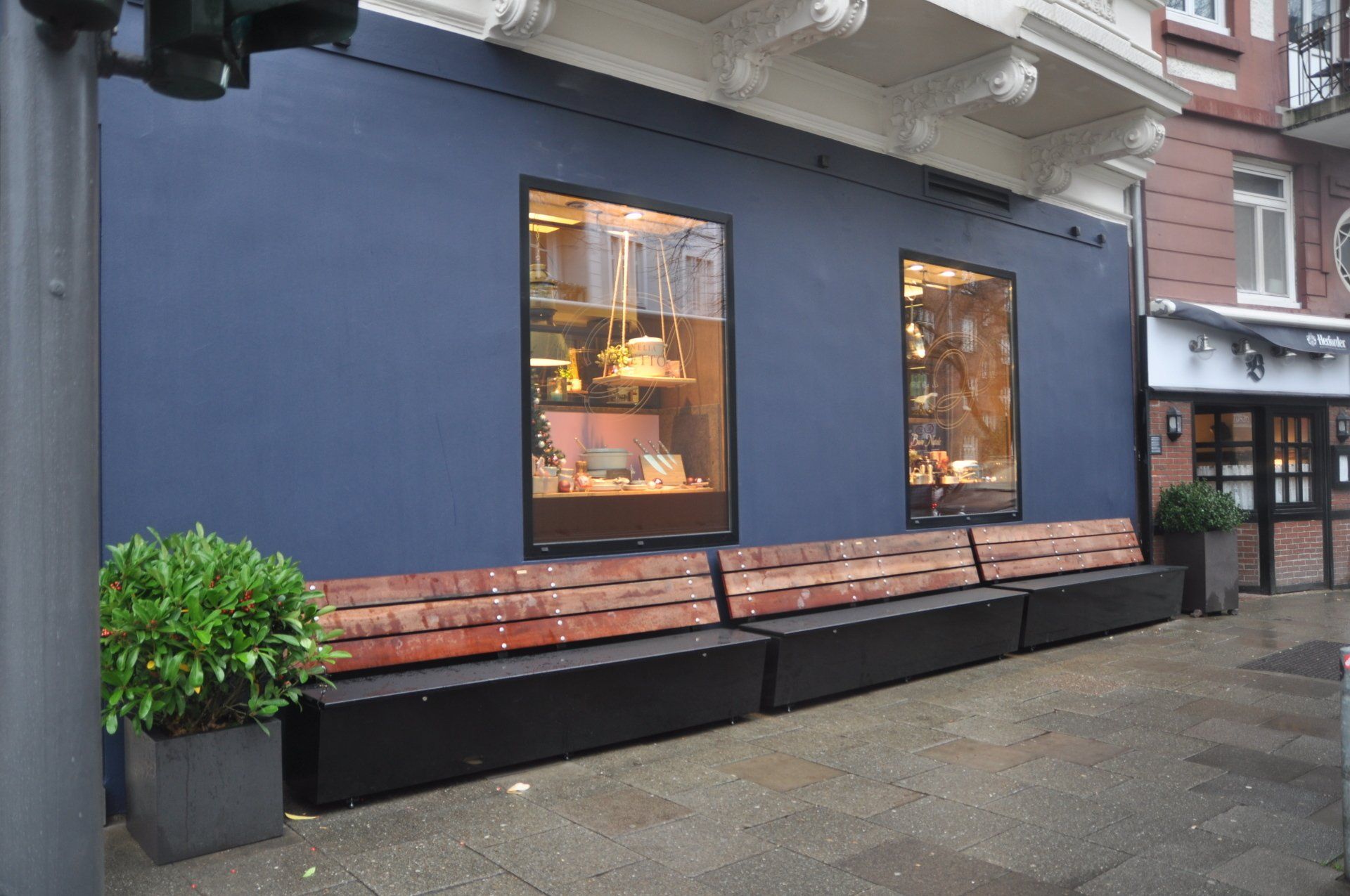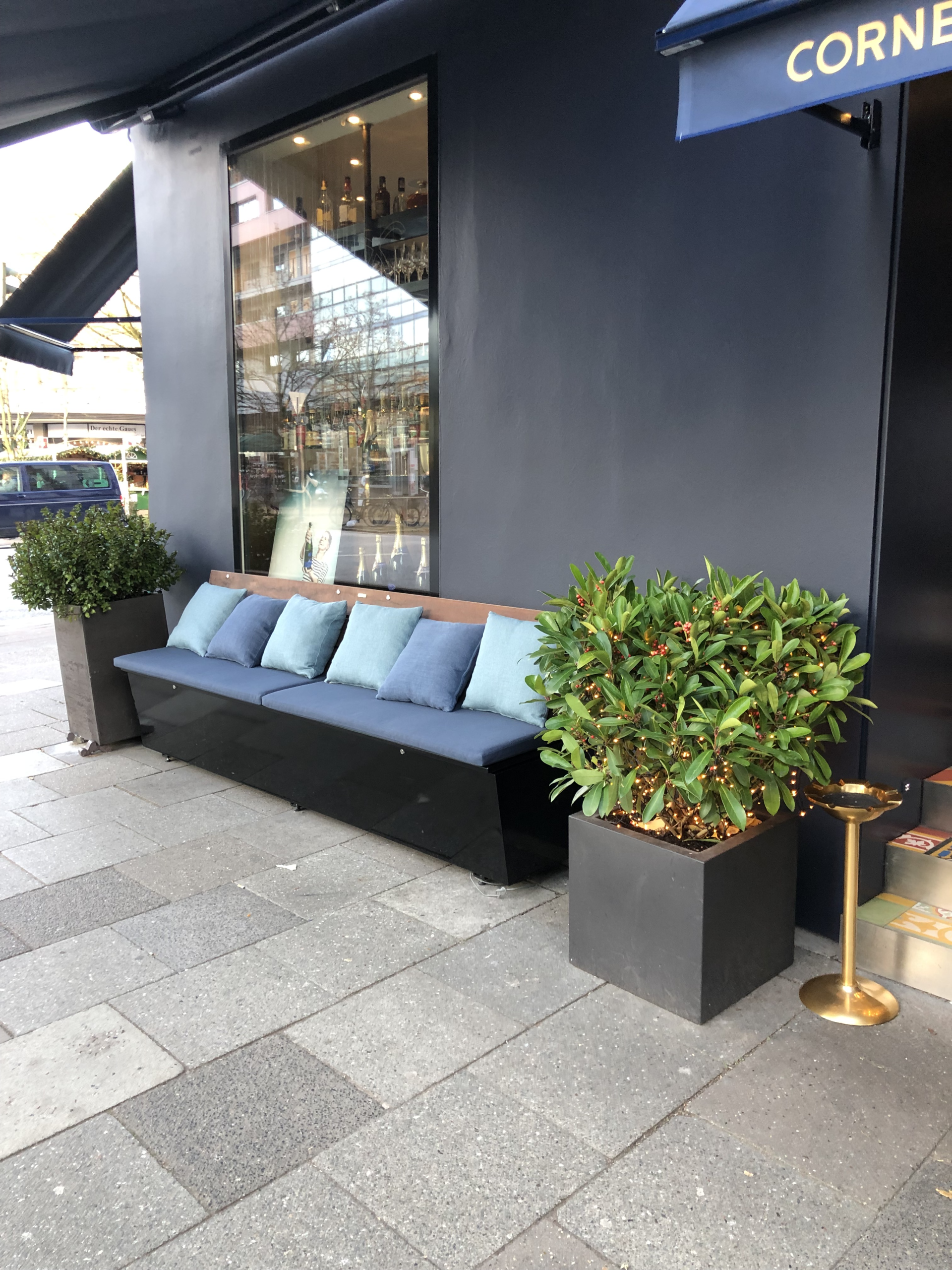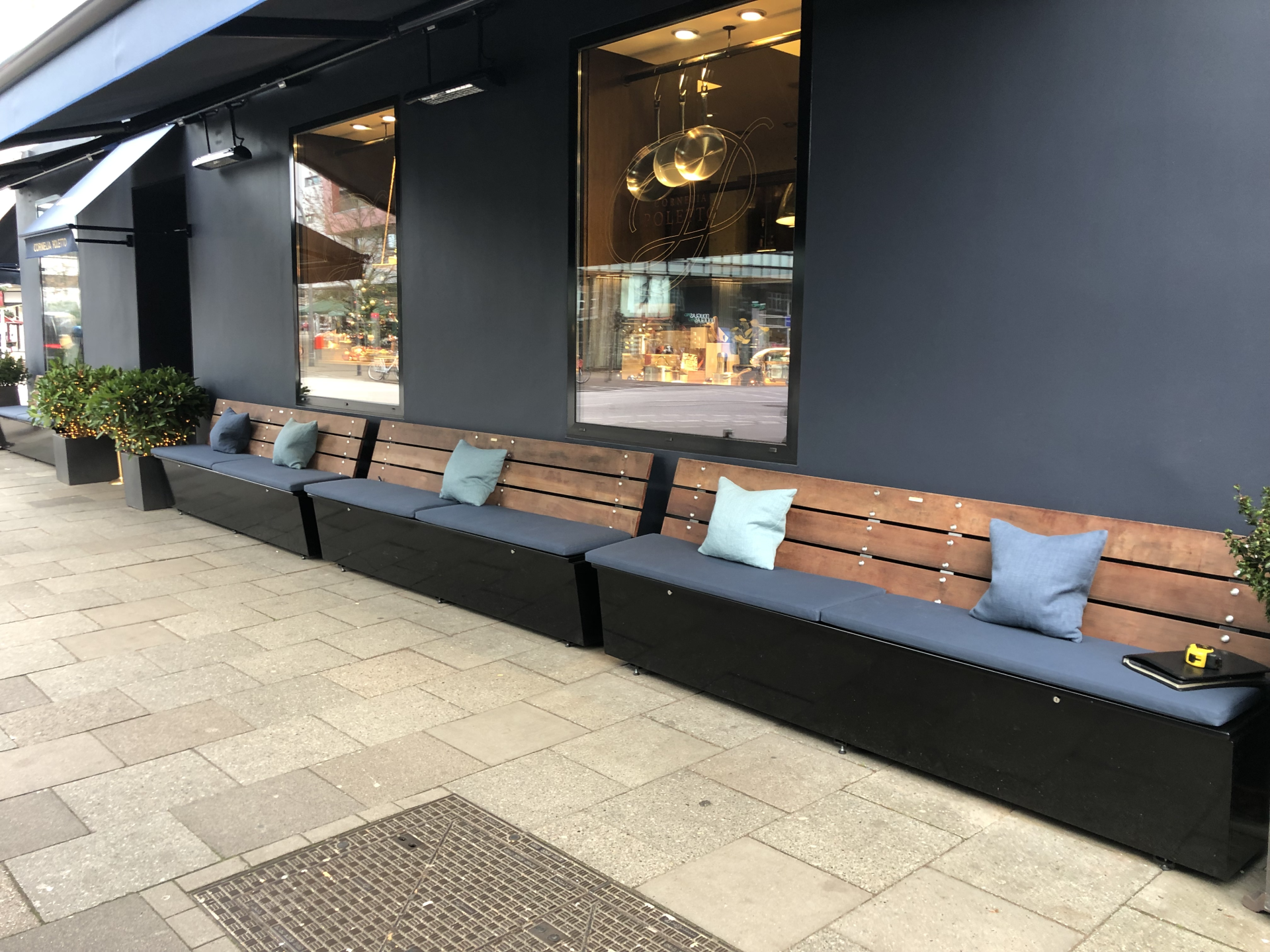 Fraaie combinatie van lange zitbanken en opbergkisten. Gemaakt van staal en gelakt in zwart. Met de rugleuning van duurzaam onbehandeld hardhout. Stelvoeten onder de banken om alles netjes recht te kunnen zetten. Mooi aangekleed met decoratie kussens. Alles in pastelkleuren, passend bij het gebouw en ook de zonneschermen.