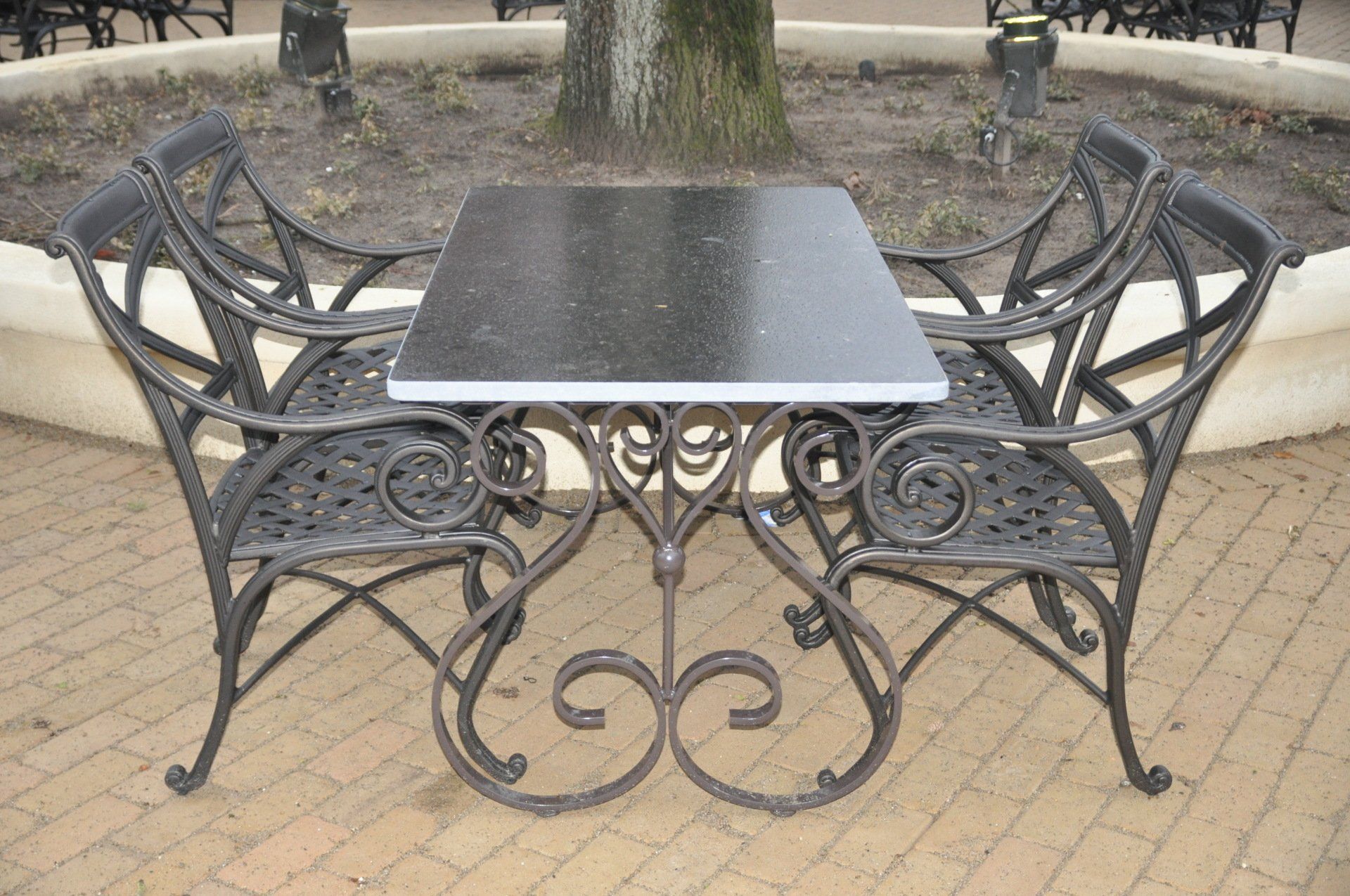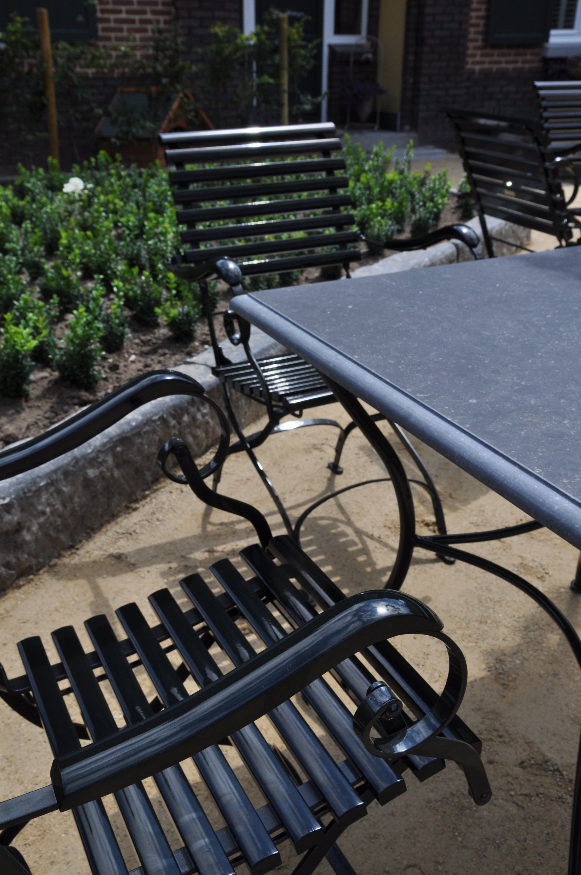 Op de binnenplaats de inrichting van een prachtig terras, mooi ingebouwd op de binnenplaats. Meubels uit de serie Moerlandt, bestaande uit vierkante tafels met een blad in natuursteen (Belgisch hardsteen), afgewerkt met een fraaie papegaaienbek omranding.