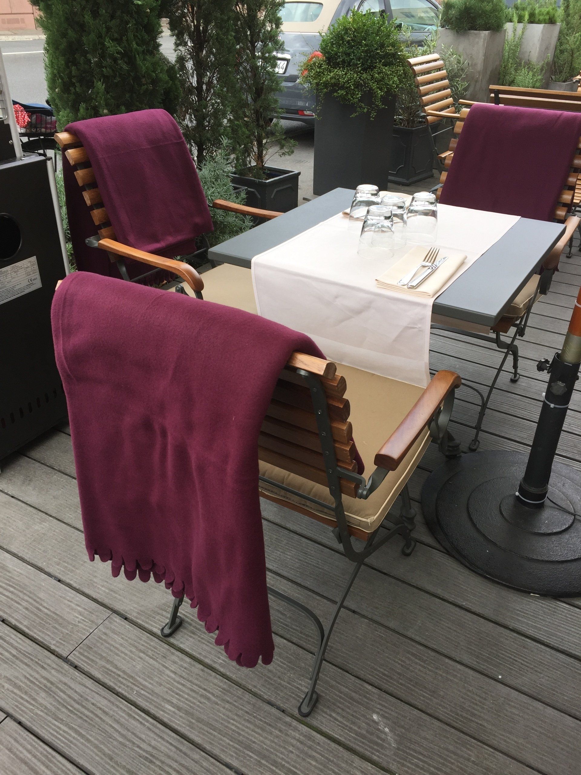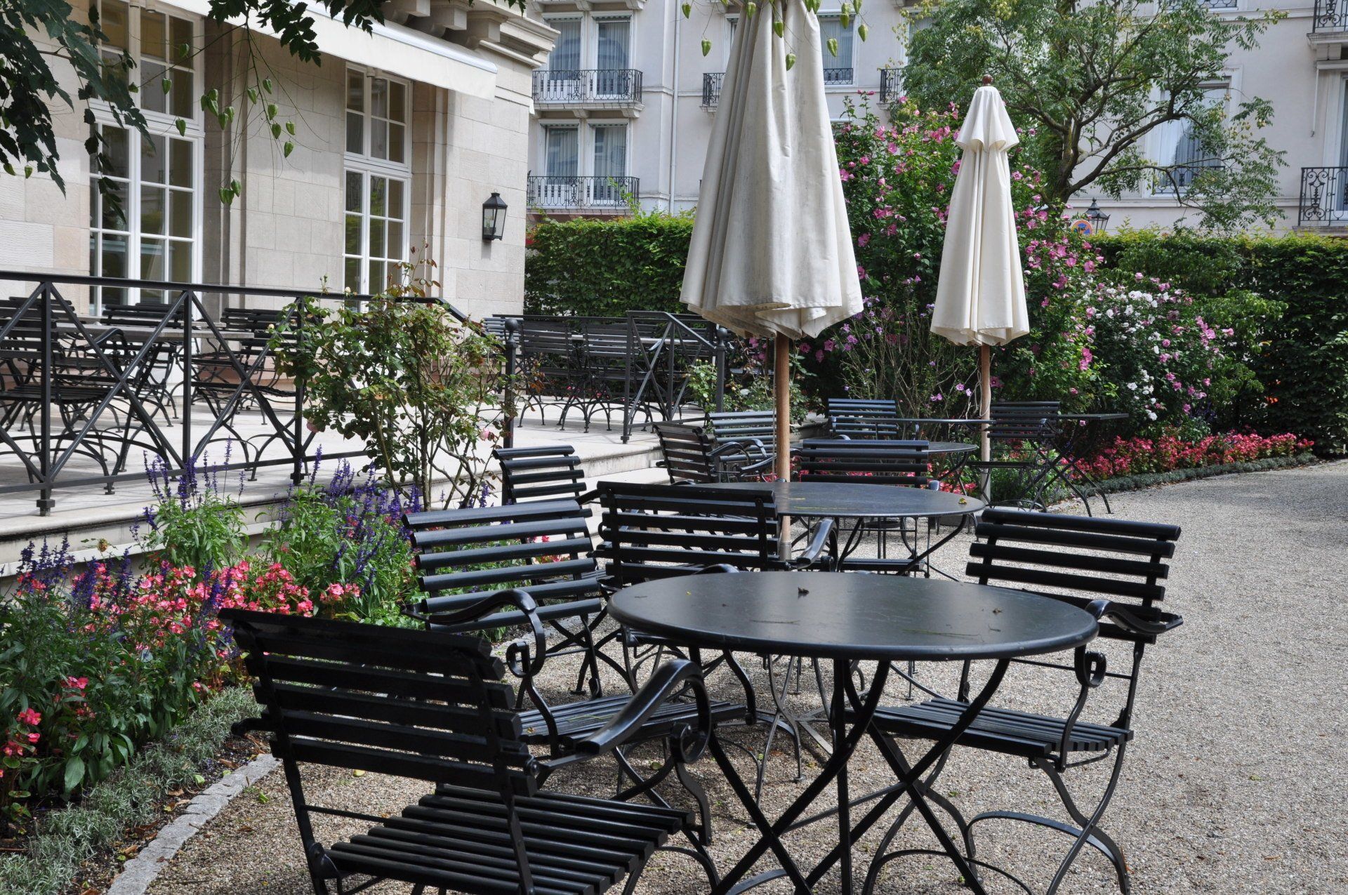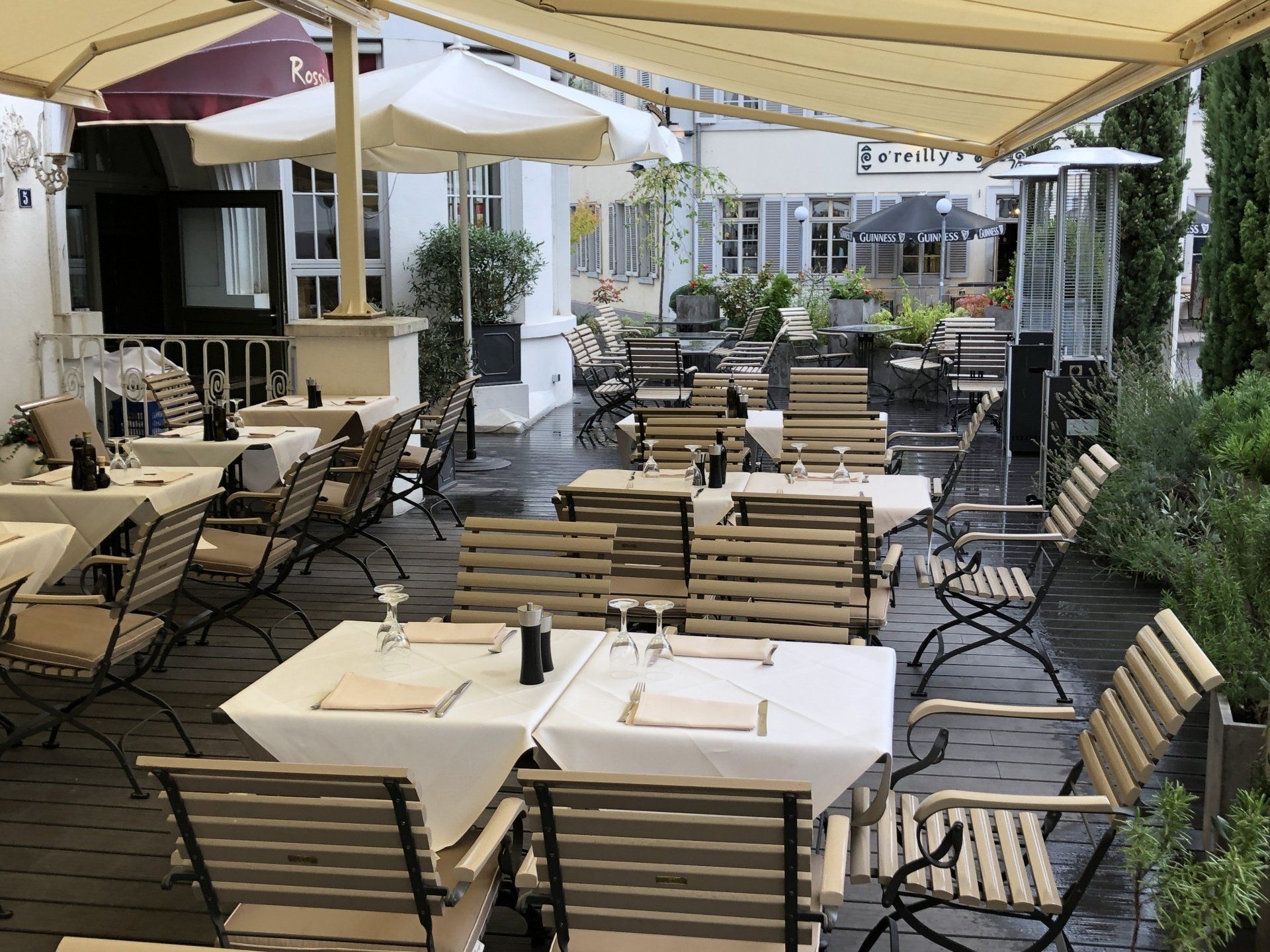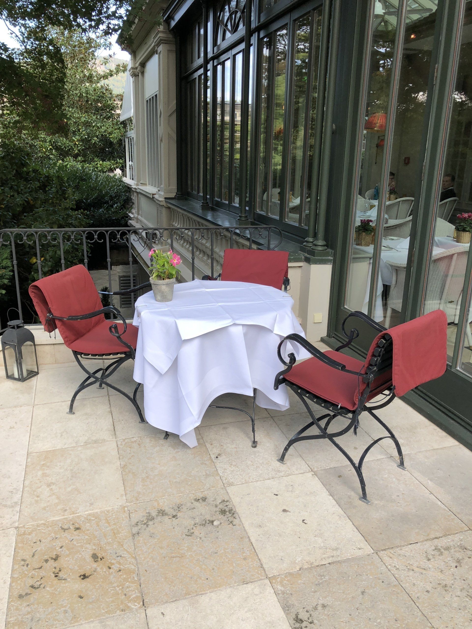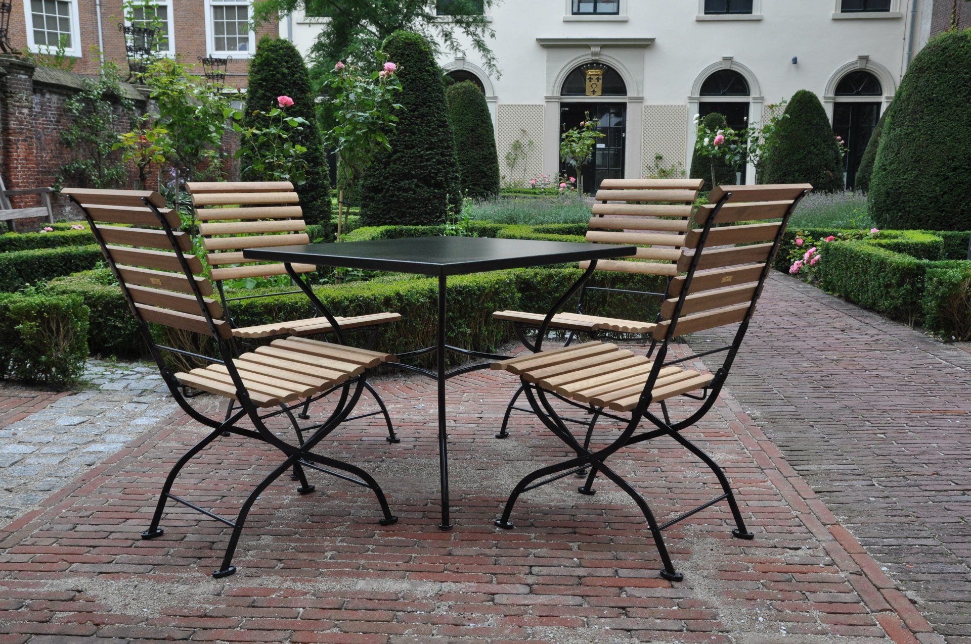 De terrassen zijn ingericht met meubels uit de Moerlandt serie. Stoelen met en zonder armleuningen, alles vol gelakt in standaard zwartgroen. Met verschillende tafels, in rond, vierkant en rechthoek, allemaal uitgevoerd met een gelakt stalen blad. De stijl van de buitenmeubels sluit perfect aan bij dit mooie klassieke hotel.