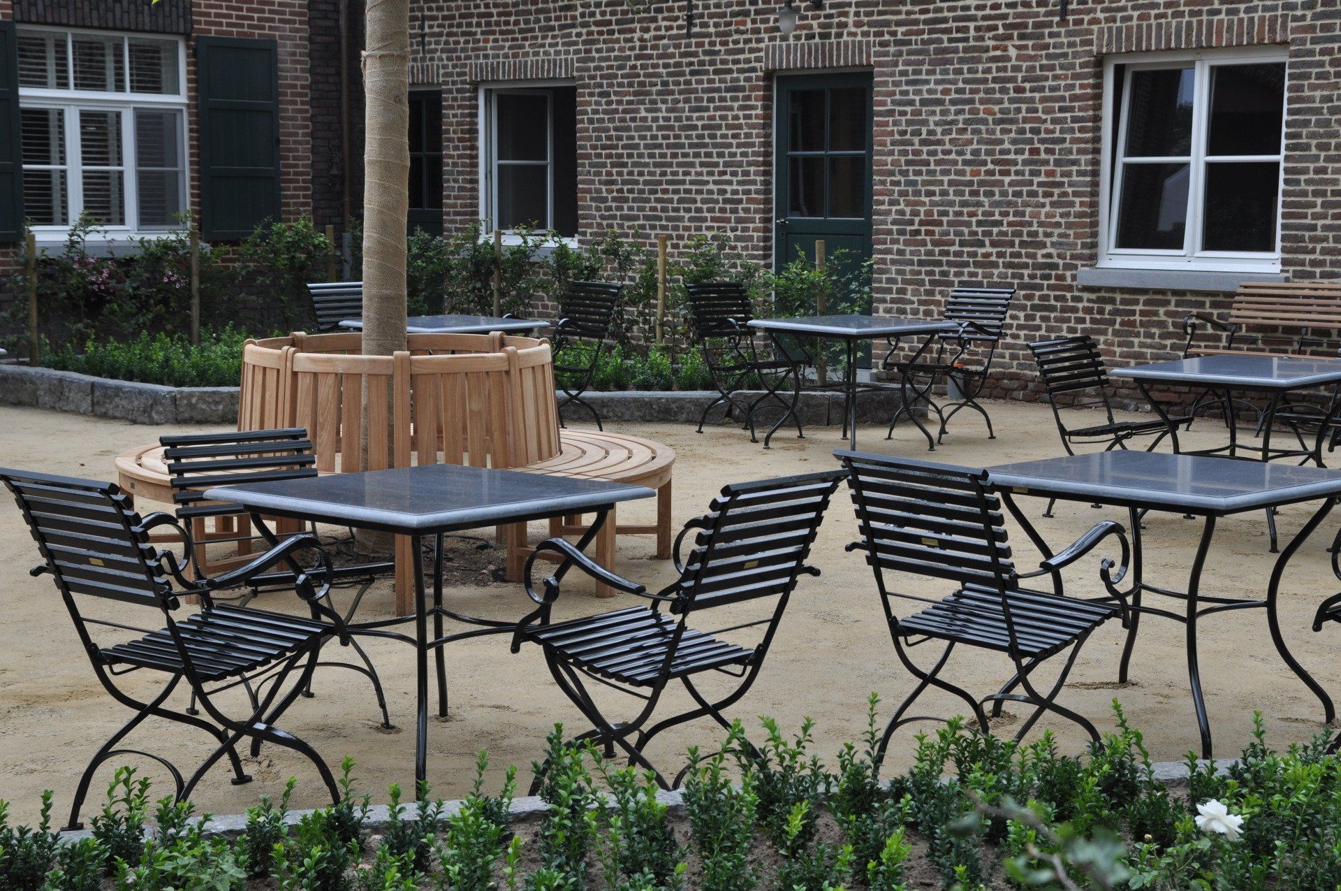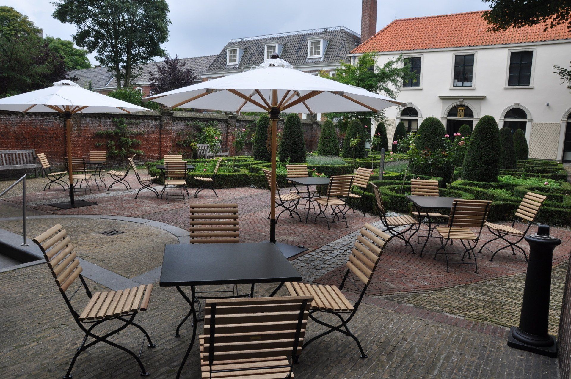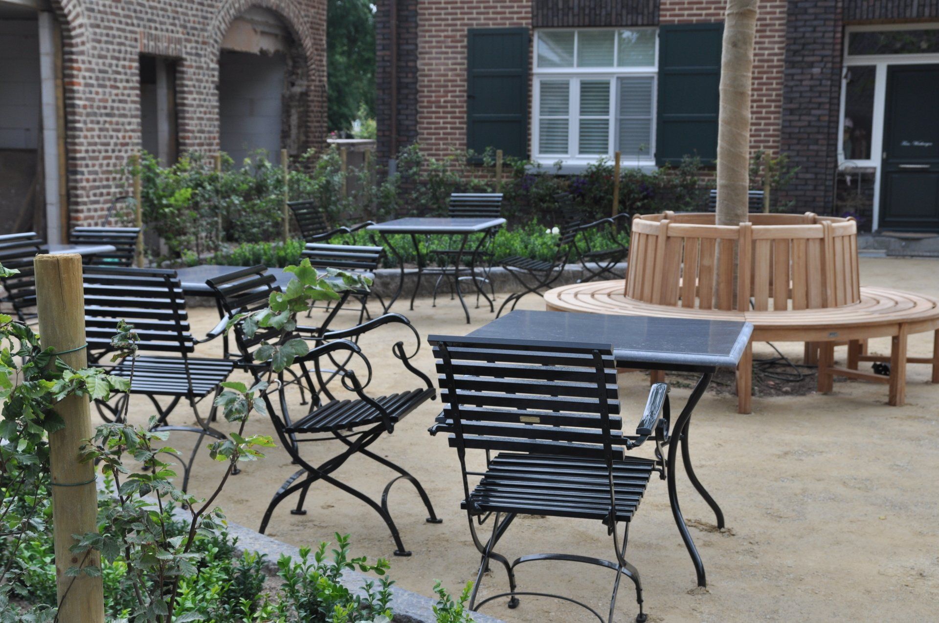 Het buiten terras is prachtig gelegen achter het museum in een mooi aangelegde binnentuin. Inrichting van het buitenterras in de mooie binnentuin.
