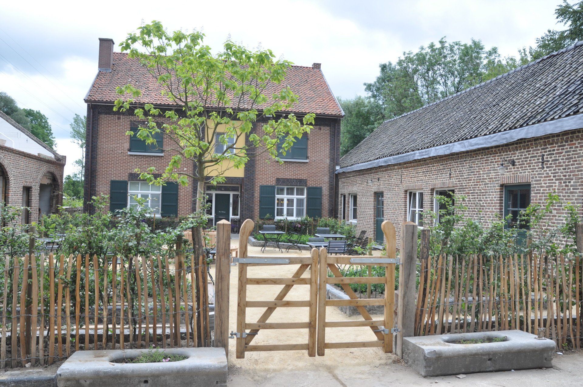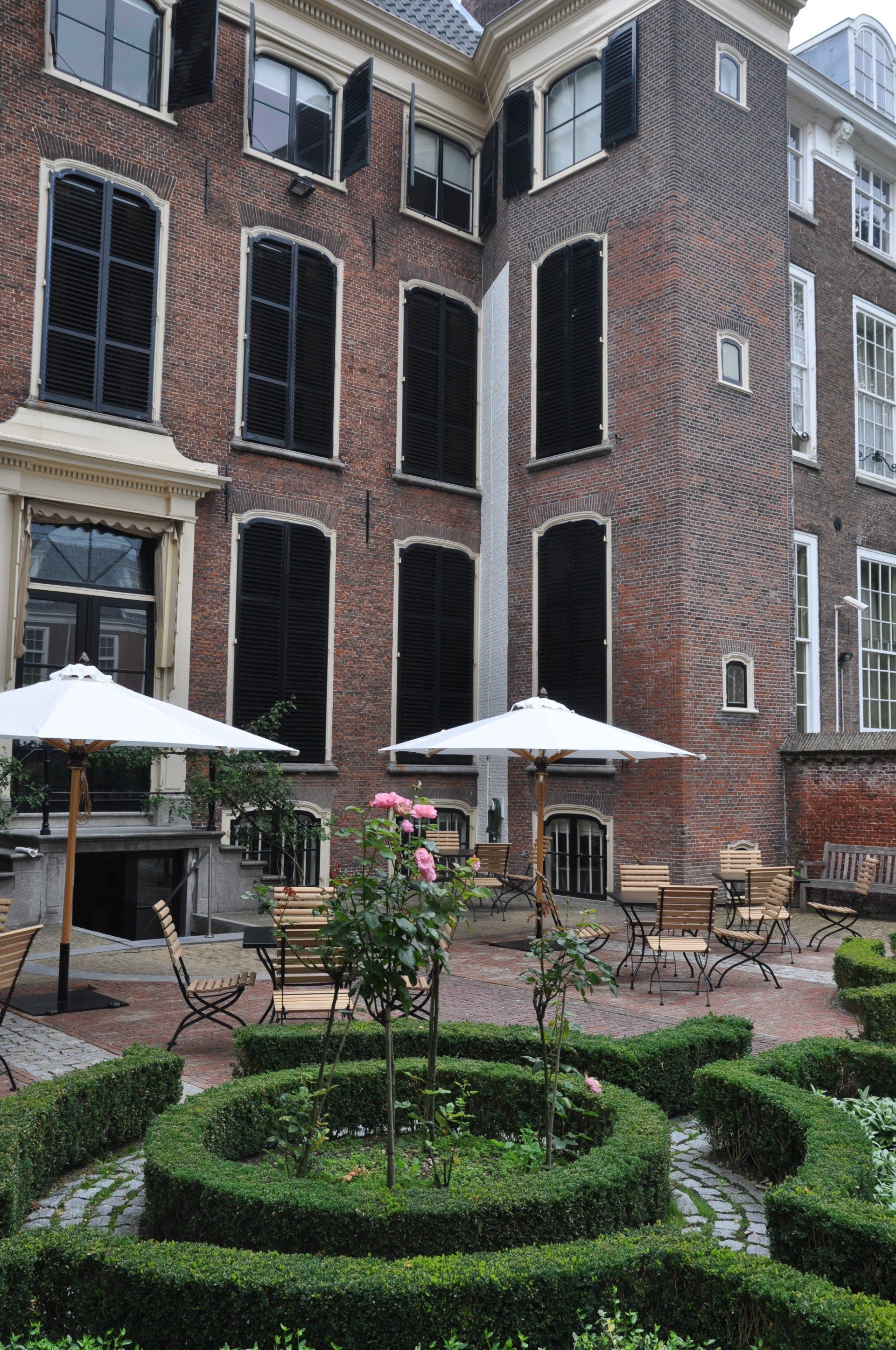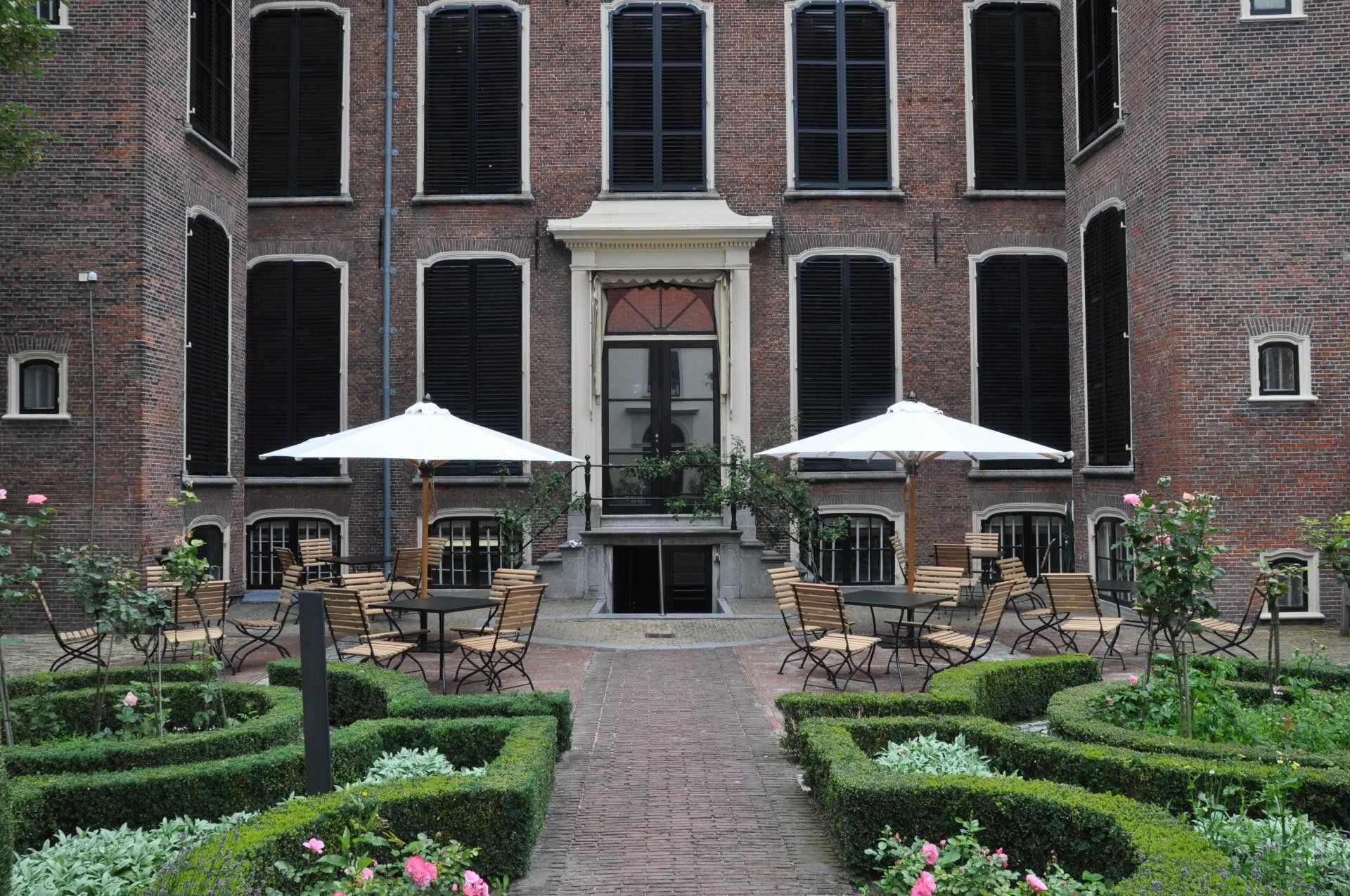 Het buiten terras is prachtig gelegen achter het museum in een mooi aangelegde binnentuin. Inrichting van het buitenterras in de mooie binnentuin.