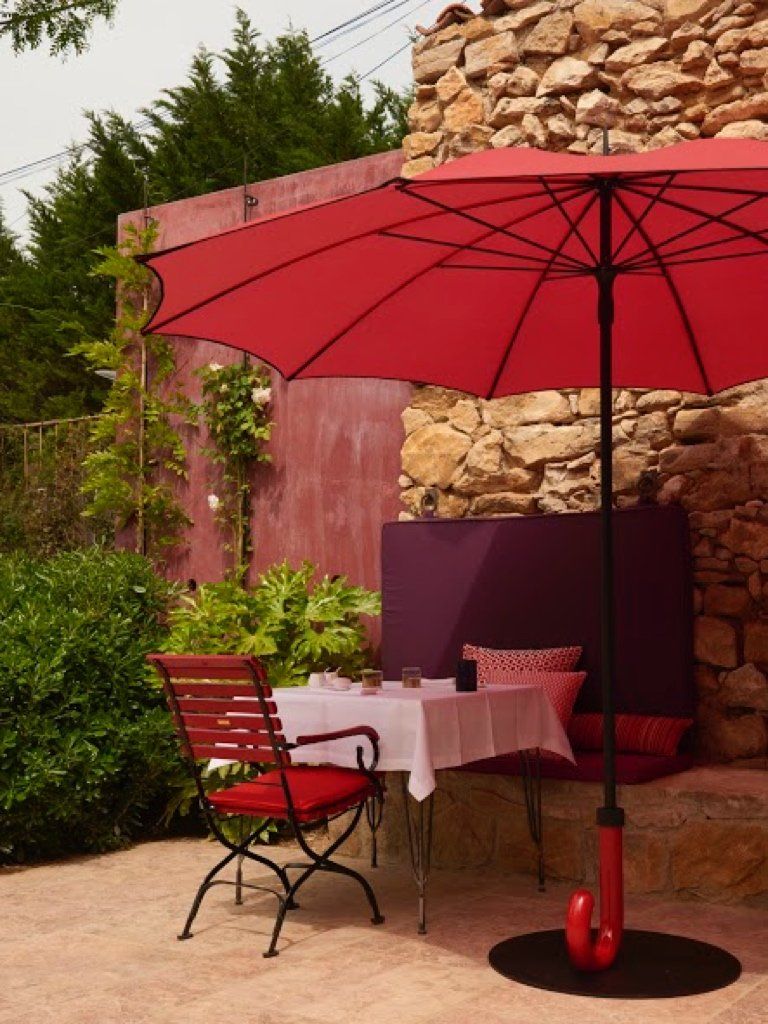Voor de inrichting van verschillende buitenterrassen is gekozen voor de buitenmeubelen van Koningdamen. Alles speciaal gelakt in de 'huiskleuren', in een felle rood-tint, de metalen frames van de stoelen in zwart, de hardhouten latten in een mooie kleur rood.